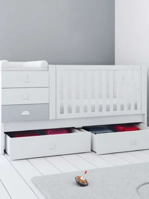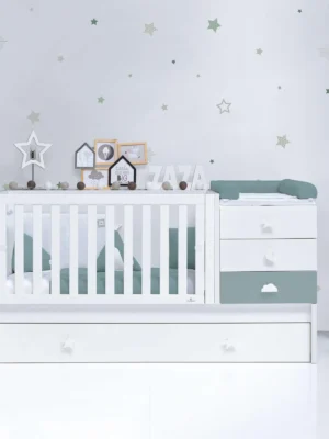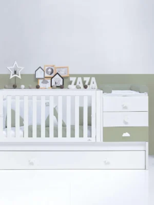 ¿Una cuna que va creciendo junto al bebé? ¡Así es! Te presentamos la cuna convertible con cajones o cama nido que tu peque necesita. Junto a la cuna de 70×140 cm tienes la zona cambiador (60×90 cm), la cajonera para guardar pañales, colonias, etc…, varias estanterías y, en la parte inferior, cajones o cama nido (a elegir). Además, te permitirá tener la habitación del bebé ordenada y limpia. A medida que el bebé vaya creciendo, podrás transformarla en cama de 90, escritorio infantil, mesita de 3 cajones y book estantería. Muebles pensados para ahorrar y durar.